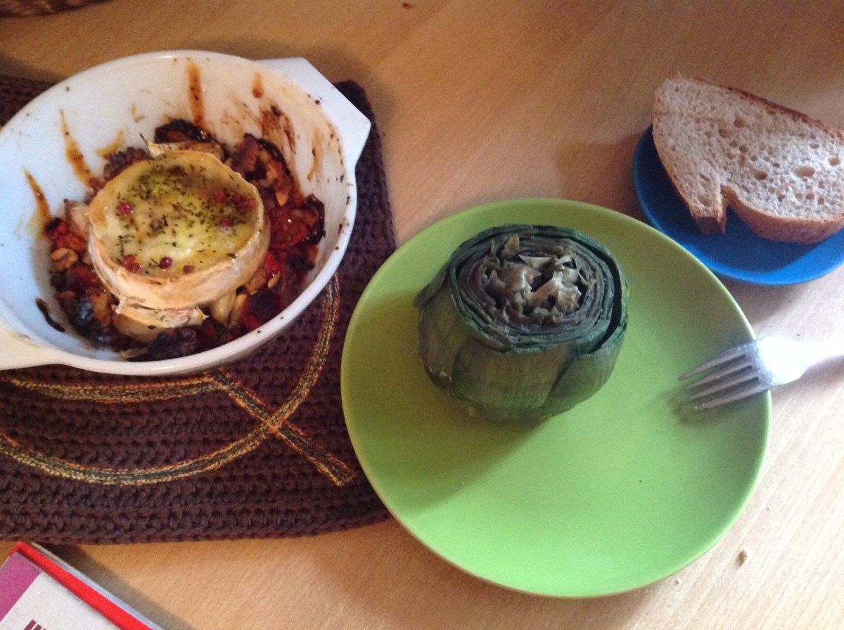 - Die Artischocke und den Käse mit dem Gemüse mit Brot geniessen. Die ersten Artischockenblätter lassen sich nur am unteren Ende verzehren, je tiefer man in das Innere des Gemüses gelangt, desto zarter und vollständiger essbar werden die Blätter, bis man auf das Heu (nicht geniessbar) stösst. Als letztes den Artischockenboden essen.