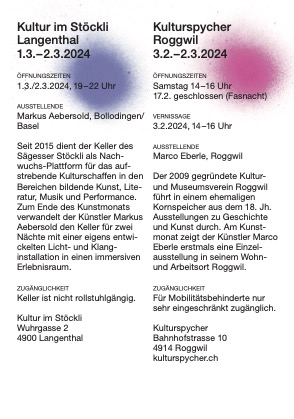 Out of Season: Kultur im Stöckli präsentiert im Rahmen des Oberaargauer Kunstmonats eine Licht-und Klanginstallation des Künstlers Markus Aebersold, zu sehen am 1. und 2. März 2024 jeweils 19:00 bis 22:00 Uhr. Am 1. März findet zudem das Abschlussfest des Kunstmonats zusammen mit dem Kunsthaus Langenthal und dem Chrämerhuus statt.