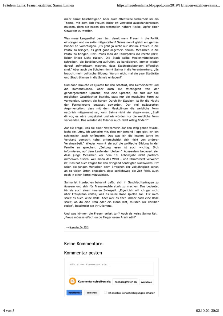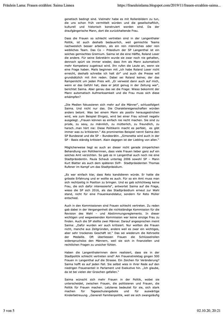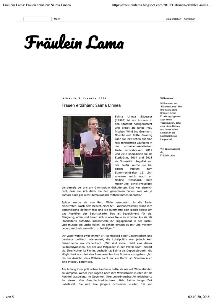Fräulein Lama ist ein Langenthaler Politblog. Die Bloggerin interviewte mich zu meienr Arbeit als Politikerin und meinen frauenspezifischen Anliegen: https://fraeuleinlama.blogspot.com/2019/11/frauen-erzahlen-saima.html