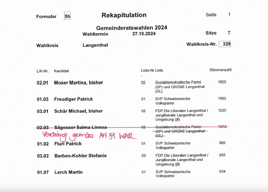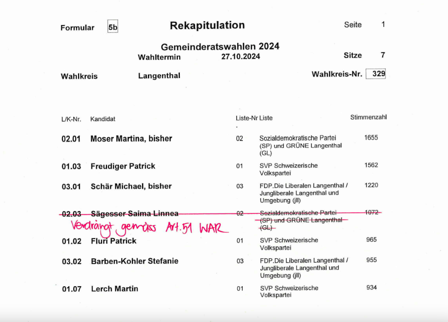 Theoretisch wurde ich als Gemeinderätin gewählt mit sagenhaften 1072 Stimmen und wäre somit auf dem vierten Sitz der gewählten Gemeinderät*innen platziert worden. Doch leider führte das Wahlregement unserer Satdt dazu, dass ich nicht in den Gemeinderat einziehen darf, da unser Stapi der SP-Liste zugewiesen wird. Schade.