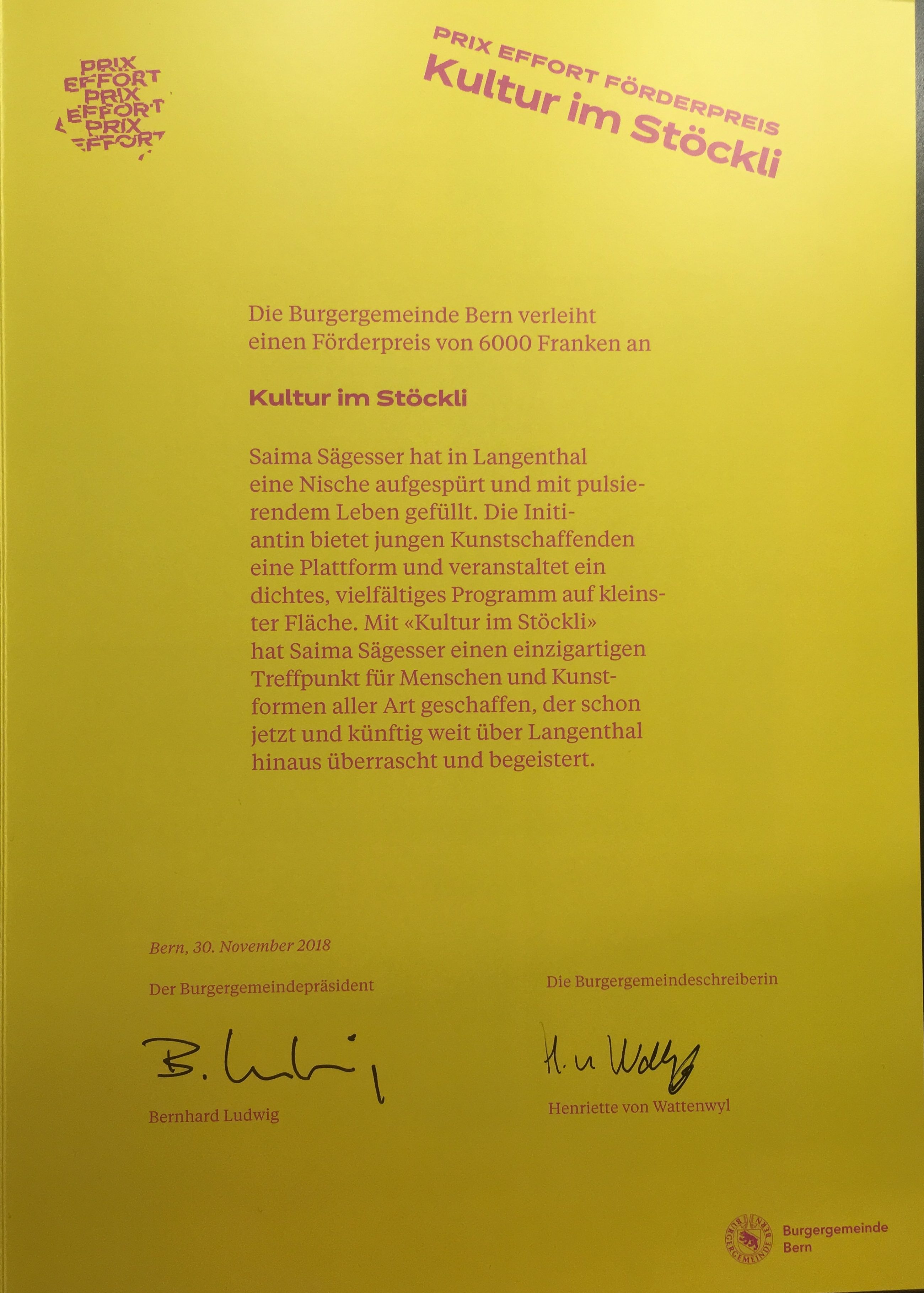 Kultur im Stöckli wurde mit einem Förderpeis im Wert von 6000.- ausgezeichnet.