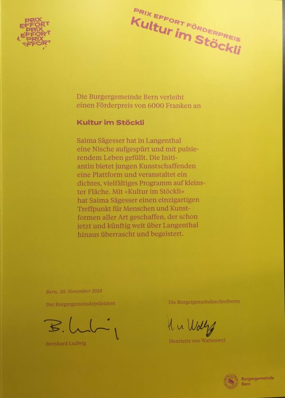 Neu heisst dieser Prixeffort – 28 versuchten ihr Glück, 5 gehörten zu den Gewinner*innen, so auch Saima Sägesser mit Kultur im Stöckli.